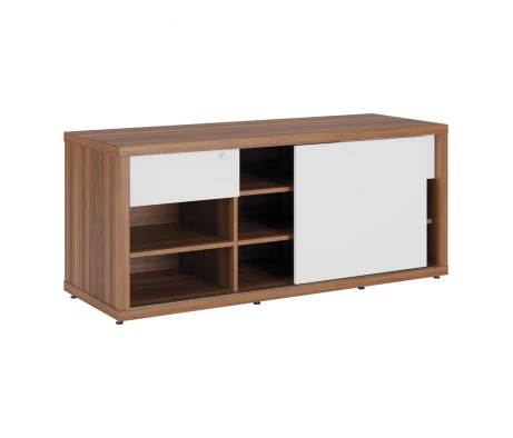 По сути она представляет собой низкий шкаф, оборудованный множеством дверей, полок и отсеков, в офисной среде его применяют для установки на него оргтехники, хранения бумаги и прочих аксессуаров. Также подобная офисная мебель может выступать в роли приставки к письменному столу руководителя, ведь выполняется она в едином стиле с остальной меблировкой серии.