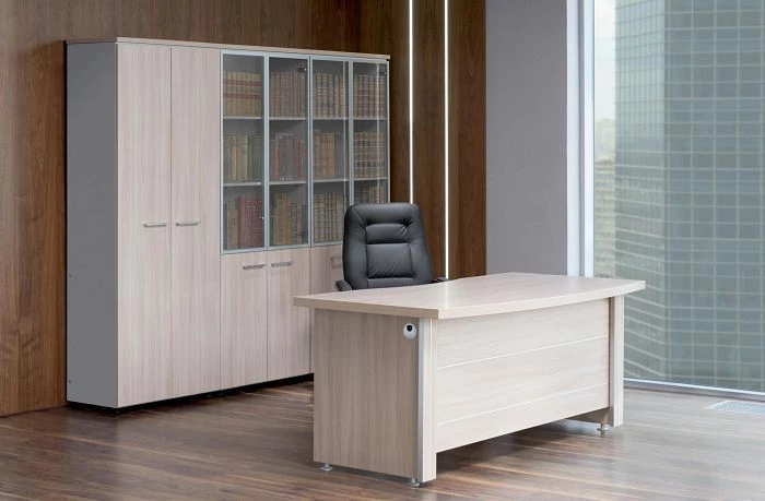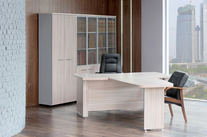 Столы различной конфигурации и эргономичной формы удовлетворят запросы любого пользователя, будут удобны в использовании. Они дополняются тумбами и шкафами, сделанными в таком же дизайне, помимо них в линейку входят брифинг-приставки, столы для переговоров и журнальный столик. Ведь кабинет директора, как правило, не ограничивается только местом работы управленца, в него также входит зона приема посетителей. Данный кабинет руководителя позволит обставить обе комнаты в единой концепции, повышая имидж как директора, так и компании в целом.