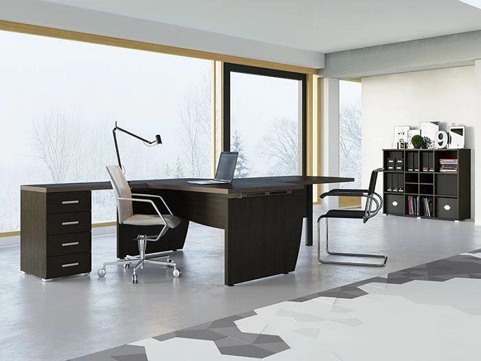 Наиболее интересной деталью всего комплекта является дизайн рабочего стола. Он состоит из основной части, которая вместо ножек имеет две боковины оригинальной формы под цвет столешнице и двух дополнительных частей, что способны расширить рабочую поверхность в случае, если необходима будет установка дополнительной техники, размещение документации и так далее.