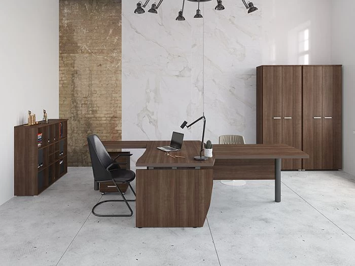 Кабинет руководителя Смарт Директор можно заказать в двух цветах: грецкий орех табак и грецкий орех табак венге. Оба цветовых решений довольно темные, поэтому их необходимо будет «разбавить» светлыми элементами декора или штукатуркой или обоями в светлых тонах.