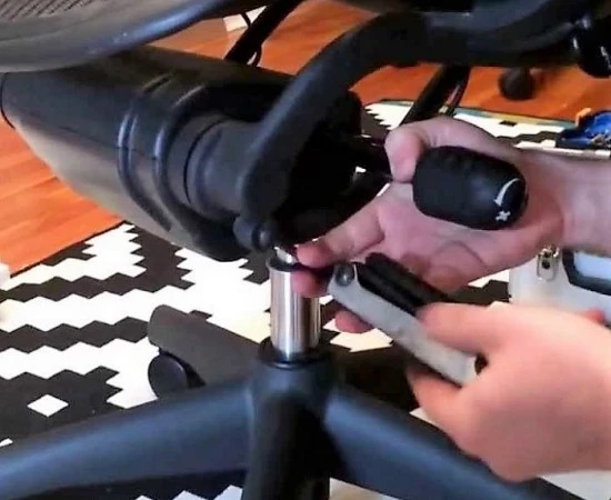 - Соедините роликовые колеса с гнездами, вставьте штоки в специальные отверстия, при небольшом надавливании вы услышите щелчок. Иногда приходится воспользоваться резиновым инструментом, тут главное не переусердствовать и не задевать пластиковые части. Как только установлены колеса, переверните пятилучье и нажмите.